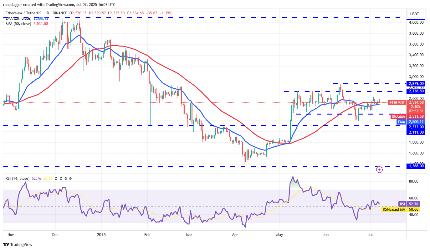 Buyers are trying to push the price above $2,635, clearing the path for a rally to $2,738. Sellers are expected to fiercely defend the $2,738 to $2,879 zone. If the price turns down from the overhead zone, the ETH/USDT pair could find support at the 20-day EMA. If the price bounces off the 20-day EMA, the bulls will again try to drive the pair above $2,879.