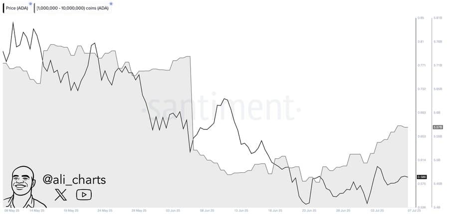 Whale wallets holding 1M–10M ADA absorbed 120 million tokens (worth roughly $71 million) over the past two weeks, according to Santiment data shared by Ali Martinez.