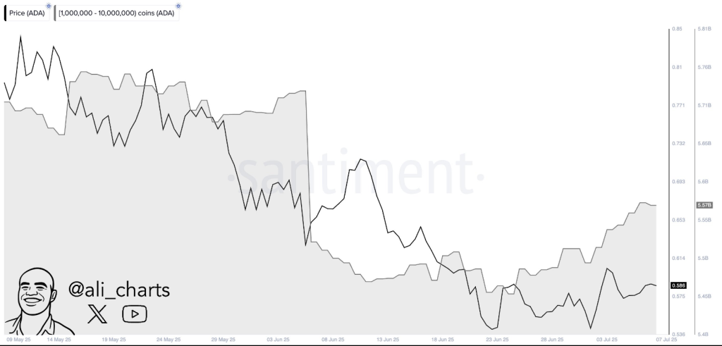 Analyst Ali Martinez has noted that large holders scooped up about 120 million ADA over the past two weeks. These addresses, each holding between 1 million and 10 million ADA, now control roughly 5.5 billion ADA—worth around $3.3 billion at current prices.