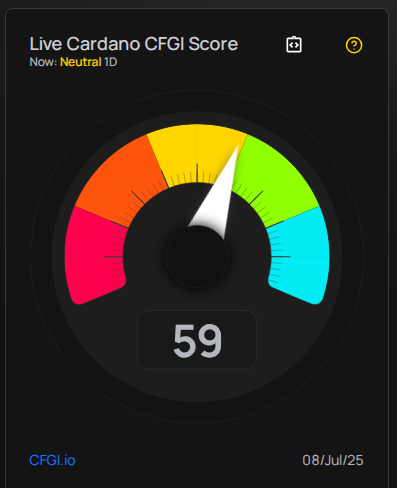 Right now, technical indicators lean bearish, and the Fear & Greed Index sits at 59 (Neutral). Cardano has seen 14 out of the last 30 days end in green, with volatility around 7.54%, according to the price prediction site.
