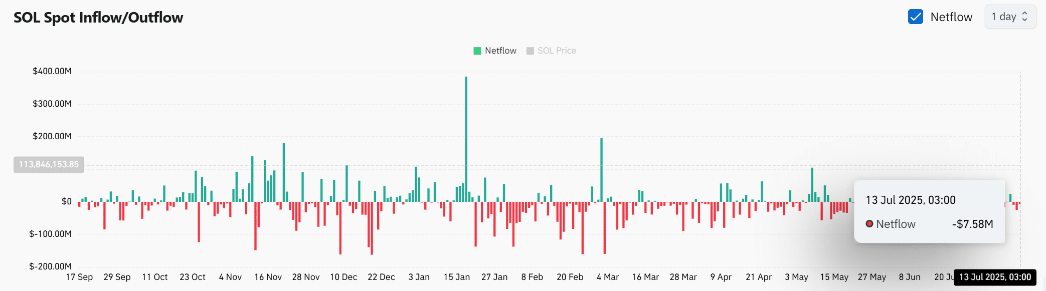 Solana continues to see steady spot outflows, with a $7.58 million net outflow on the 13th of July.