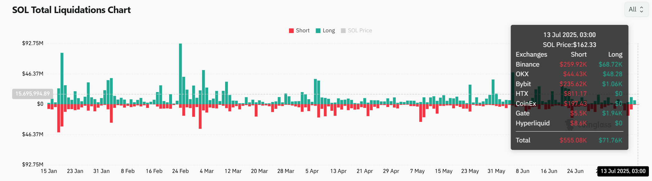 Solana experienced a sharp spike in short liquidations on the 13th of July, totaling $555K, compared to just $71K in long liquidations.