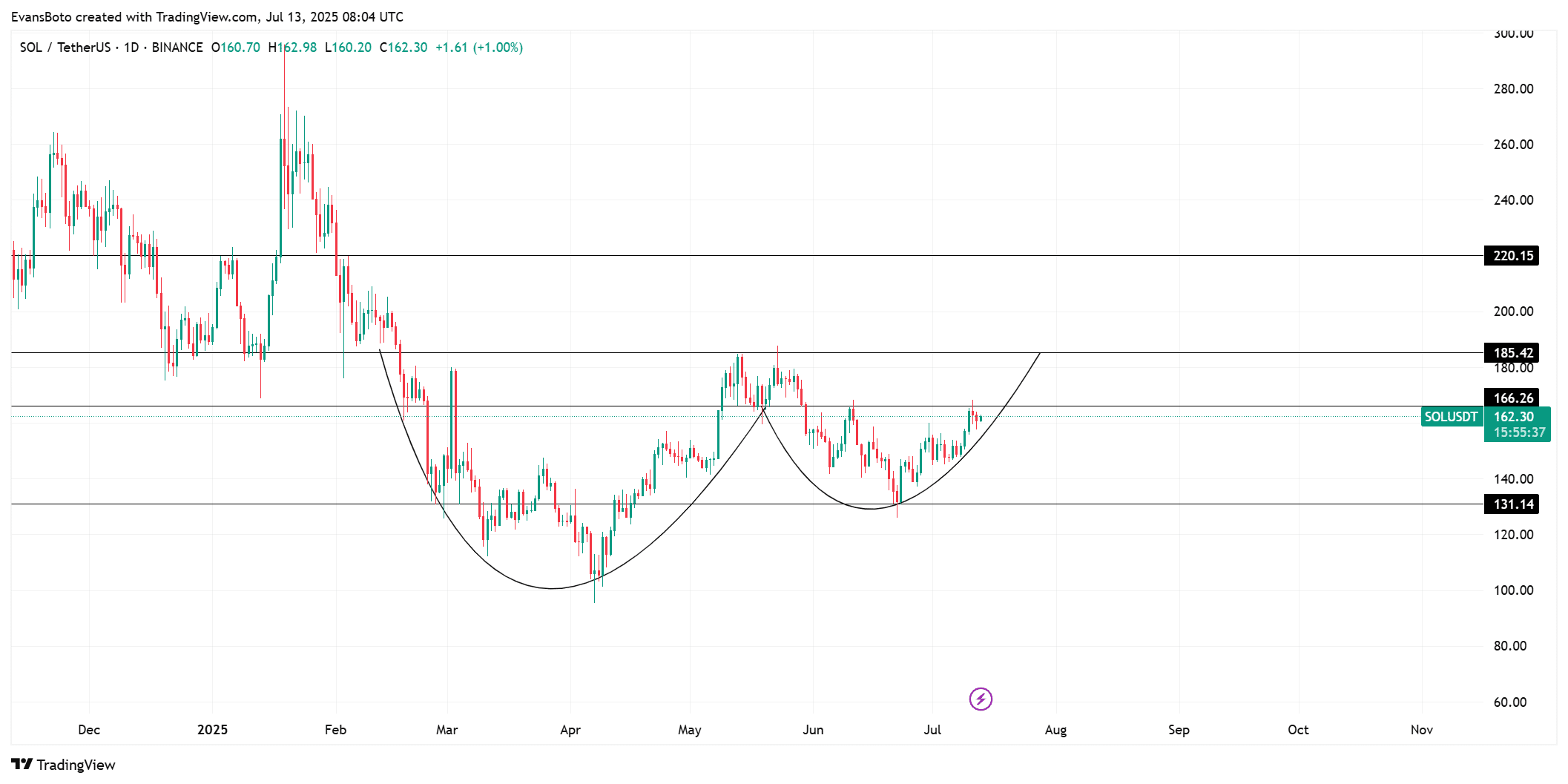 Solana has printed a textbook cup and handle pattern on the daily chart, with the cup bottoming near $131 and the handle consolidating just below the $166 neckline.