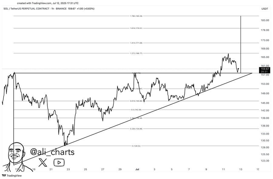 Solana [SOL] is currently retesting its breakout zone around $157 after breaking above an ascending trendline earlier this week.
