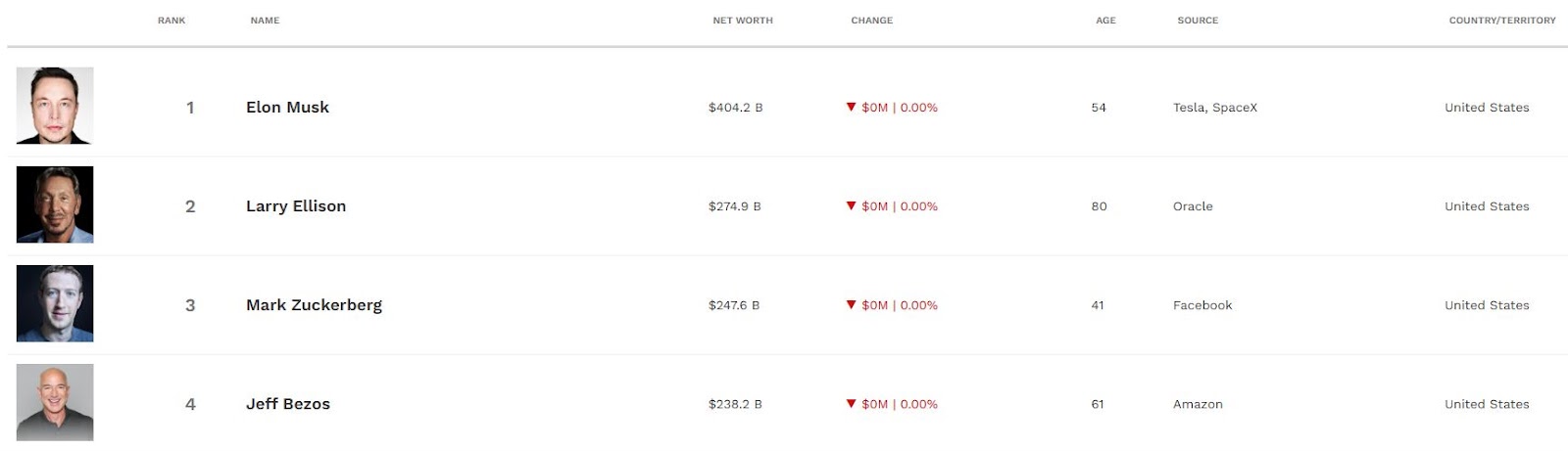 Larry Ellison, co-founder of software company Oracle, is second on the list with a fortune estimated to be $274 billion. Meta CEO Zuckerberg rounds out the top three with $274 billion to his name.