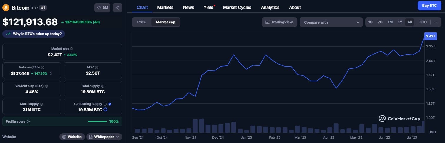 Naturally, Bitcoin continues to anchor the rally. It was priced at $121,913 with a market cap of $2.42 trillion.