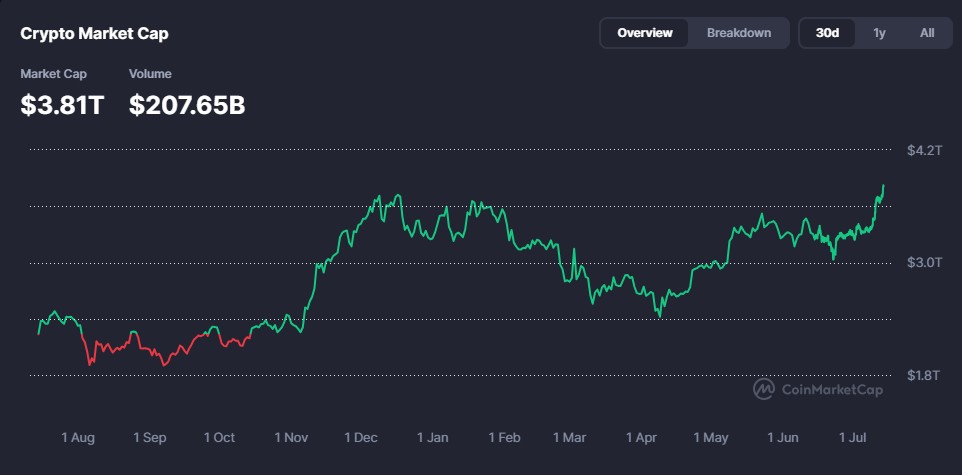 The crypto market cap is getting closer to hitting $4 trillion, led by strong gains in Bitcoin and Ethereum. Growing interest from big investors and global adoption are helping push prices higher.