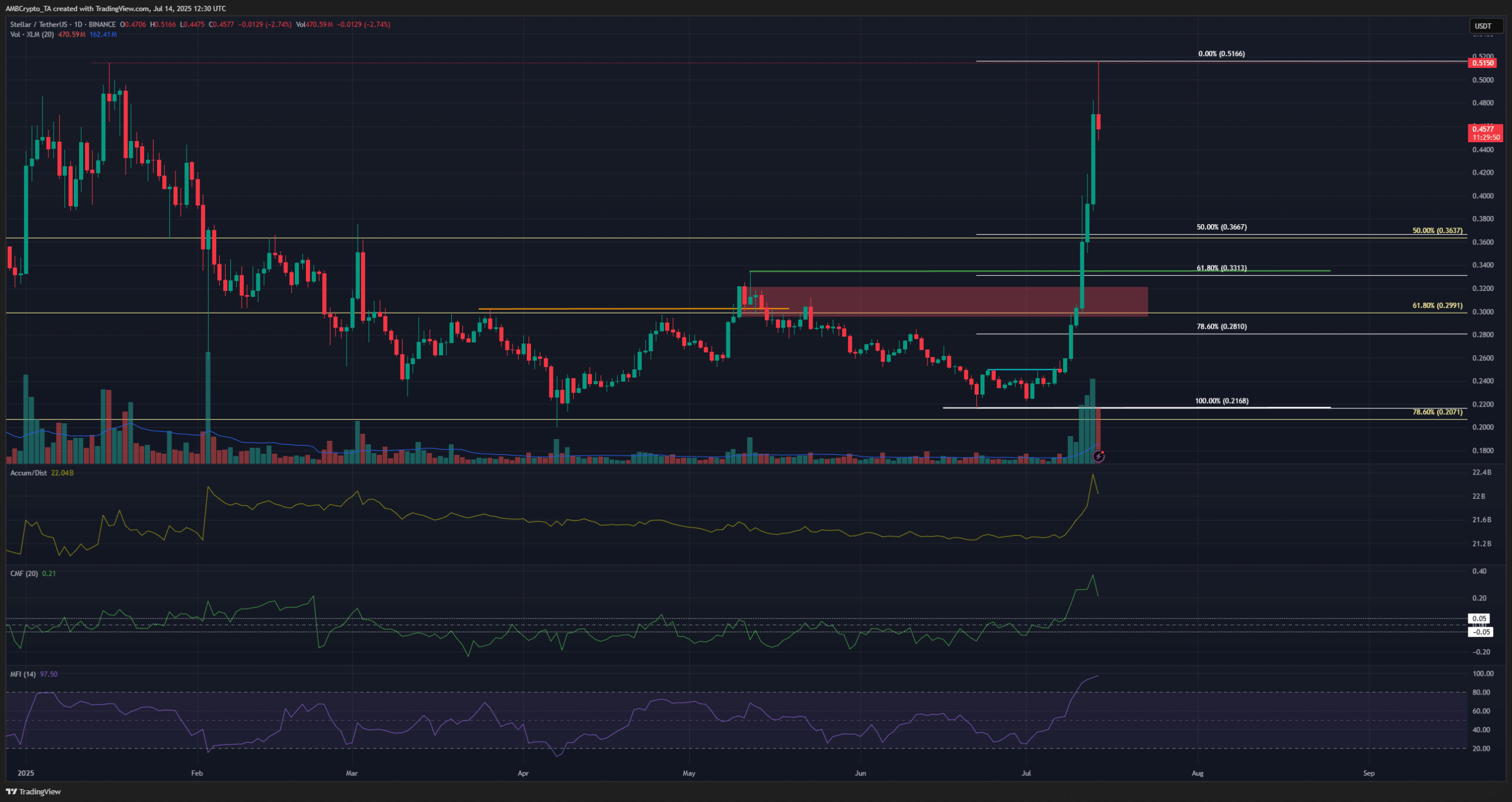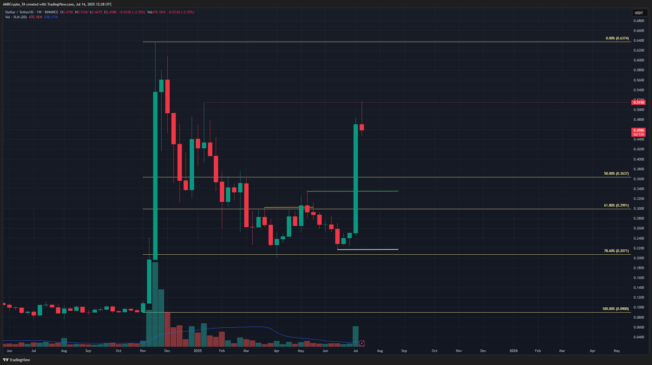 The past week’s trading saw XLM rocket past the $0.334 high, challenging the $0.515 level from early 2025.