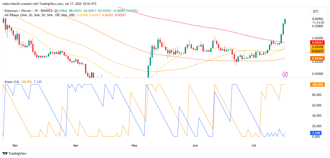 The Aroon Indicator, which measures trend strength and direction, showed the Aroon Up (orange) hitting 100%, while the Aroon Down (blue) sat at just 7.18%—a clear confirmation of bullish momentum.