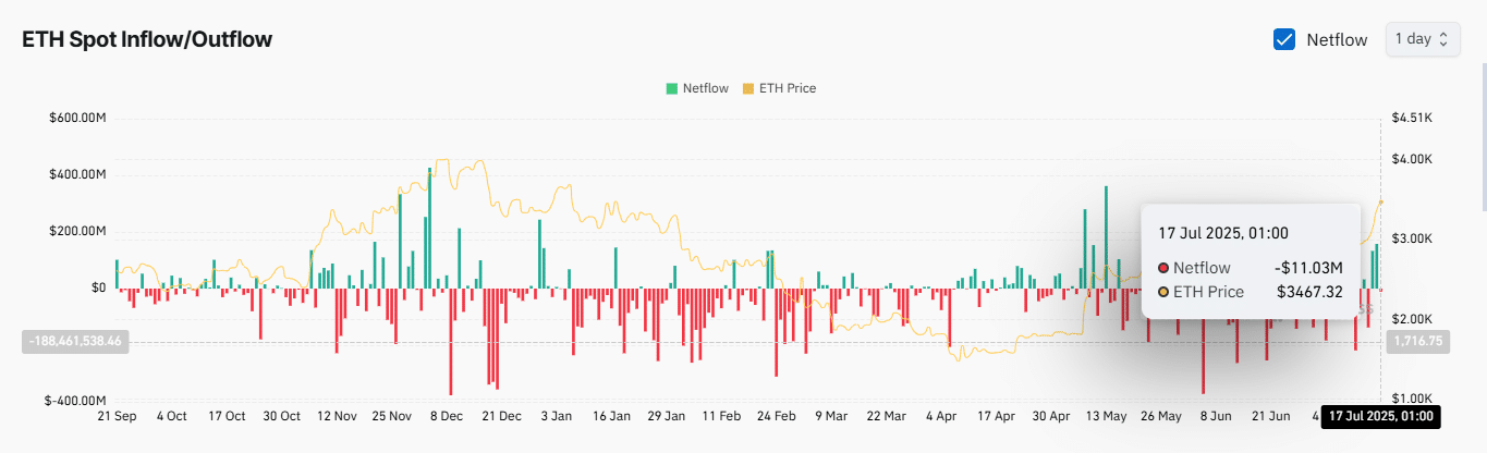 According to CoinGlass, the Spot Exchange Netflow showed a notable $11 million inflow into Ethereum over the past 24 hours.