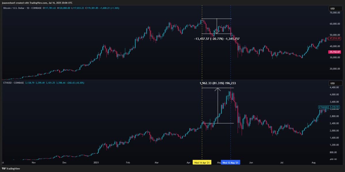 Based on the same pattern, the countdown has likely begun. Bitcoin hit a new all-time high of $123,000 on the 14th of July, before declining, potentially setting the stage for Ethereum’s breakout.