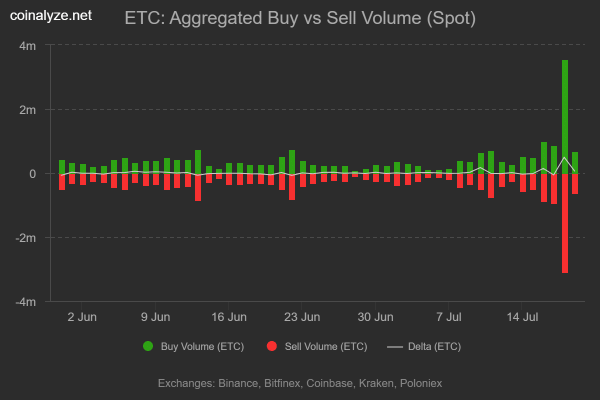 On the 18th of July, ETC saw a Spot Buy Volume of 3.57 million, compared to a Sell Volume of 3.08 million, according to Coinalyze.