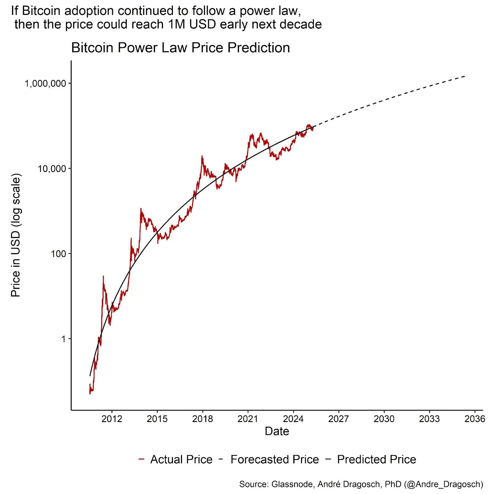 If we assume that bitcoin adoption would continue to follow such a power law in the future, the next chart suggests that the price could reach $1 million per bitcoin over the next 10 years.