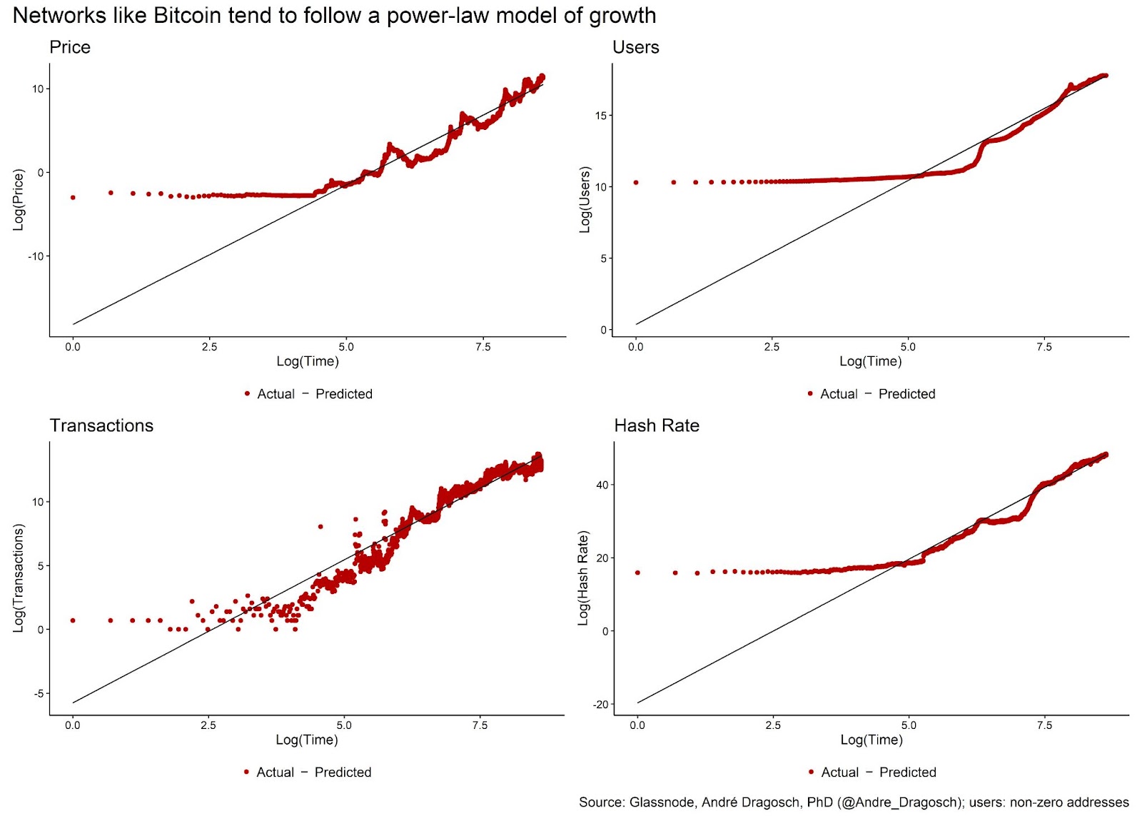 What is more is that both the number of active addresses/users as well as the hashrate of the Bitcoin network also adhere to this power law as shown in the following charts: