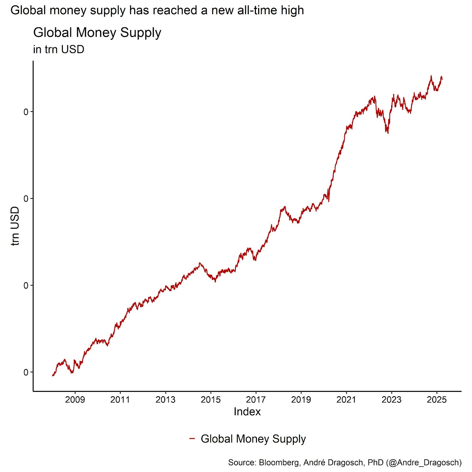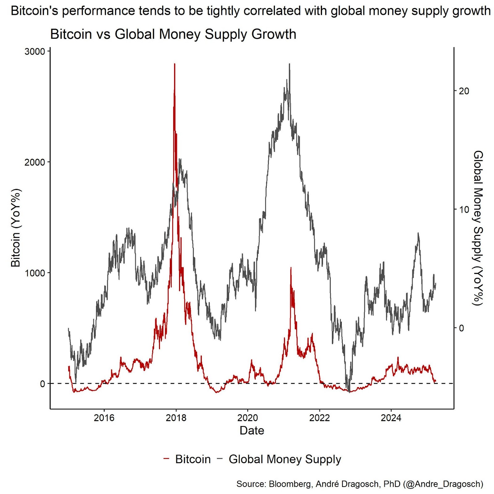 In fact, bitcoin’s performance has shown a close correlation to global money supply growth, i.e., global monetary inflation over time.