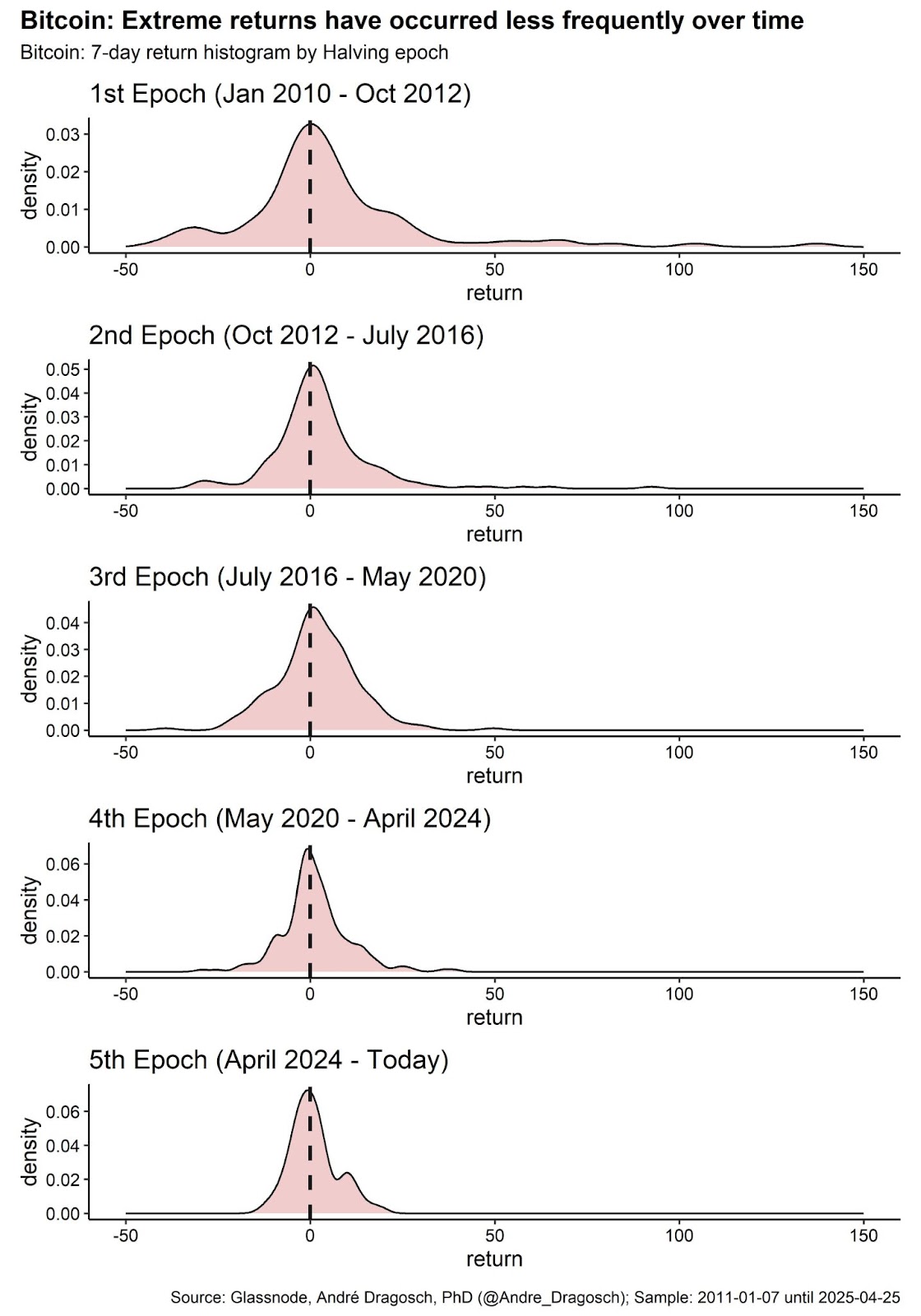 Moreover, not only has volatility decreased but also the occurrence of extreme returns, both negative and positive, has declined significantly with every Halving. In statistician’s parlance: The return distribution has become less leptokurtic. This is shown in the following chart (each panel represents a single bitcoin epoch):