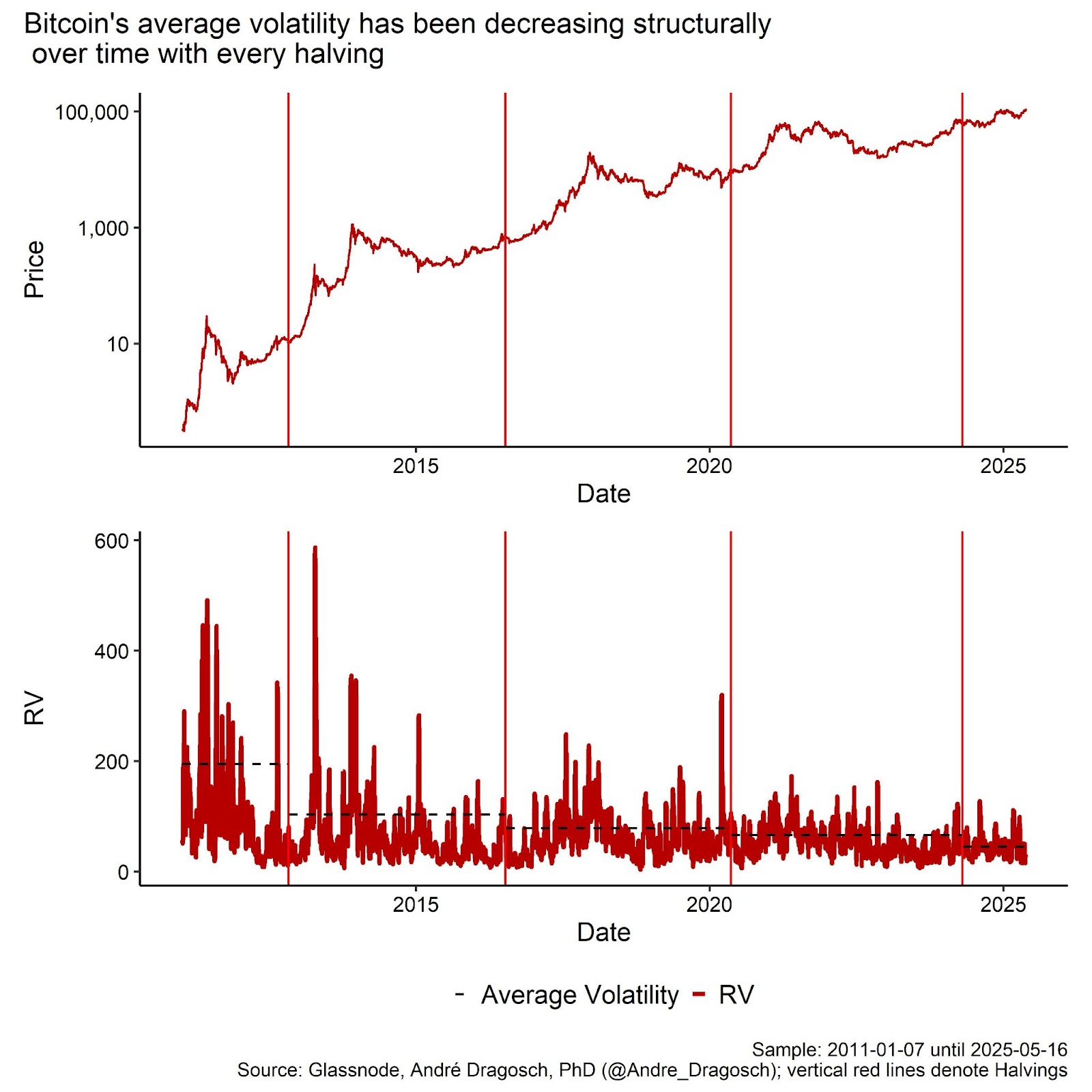 As one can see, bitcoin’s volatility has been decreasing structurally with every Halving.