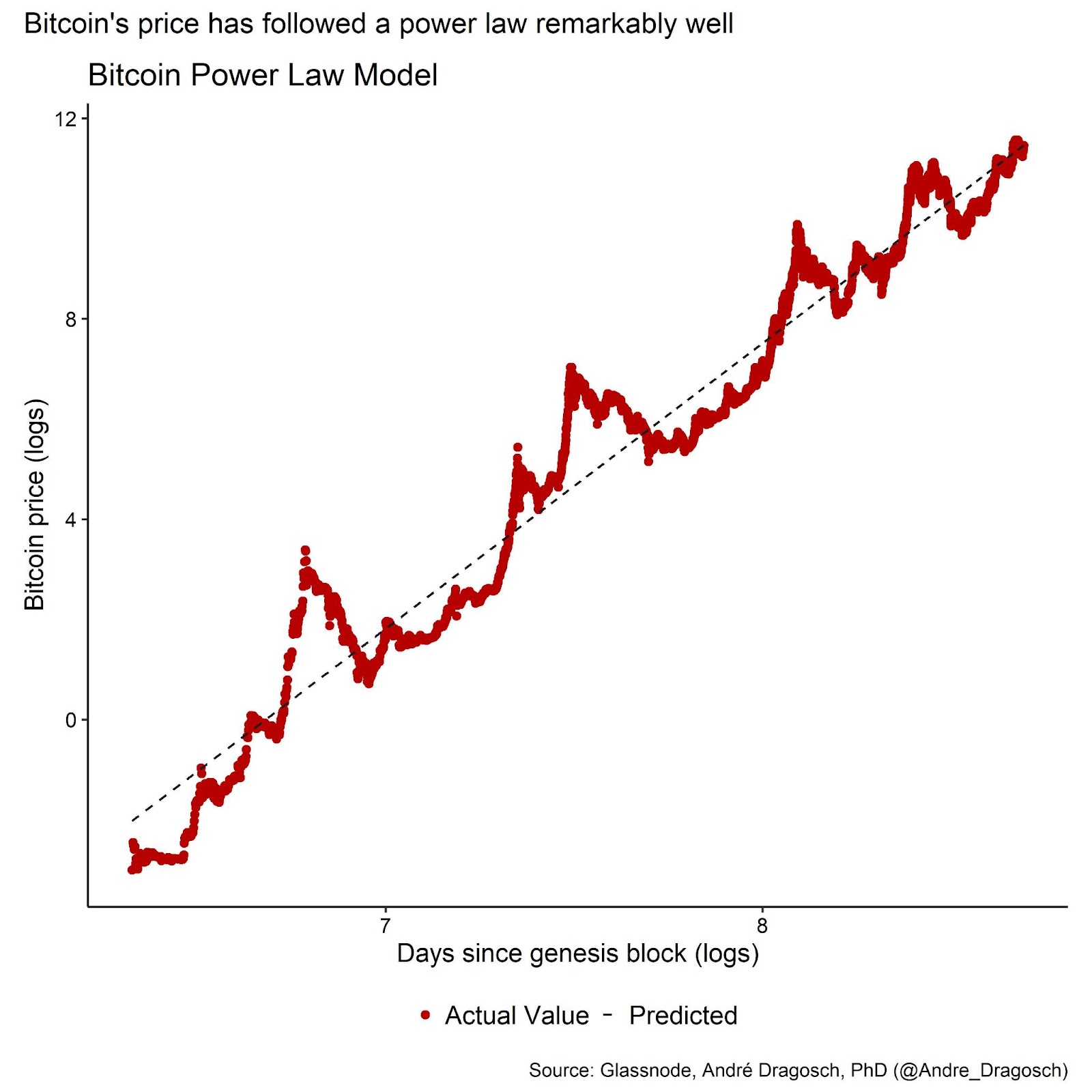 Some researchers have noticed that bitcoin’s price performance has been following a power law very closely in the past.