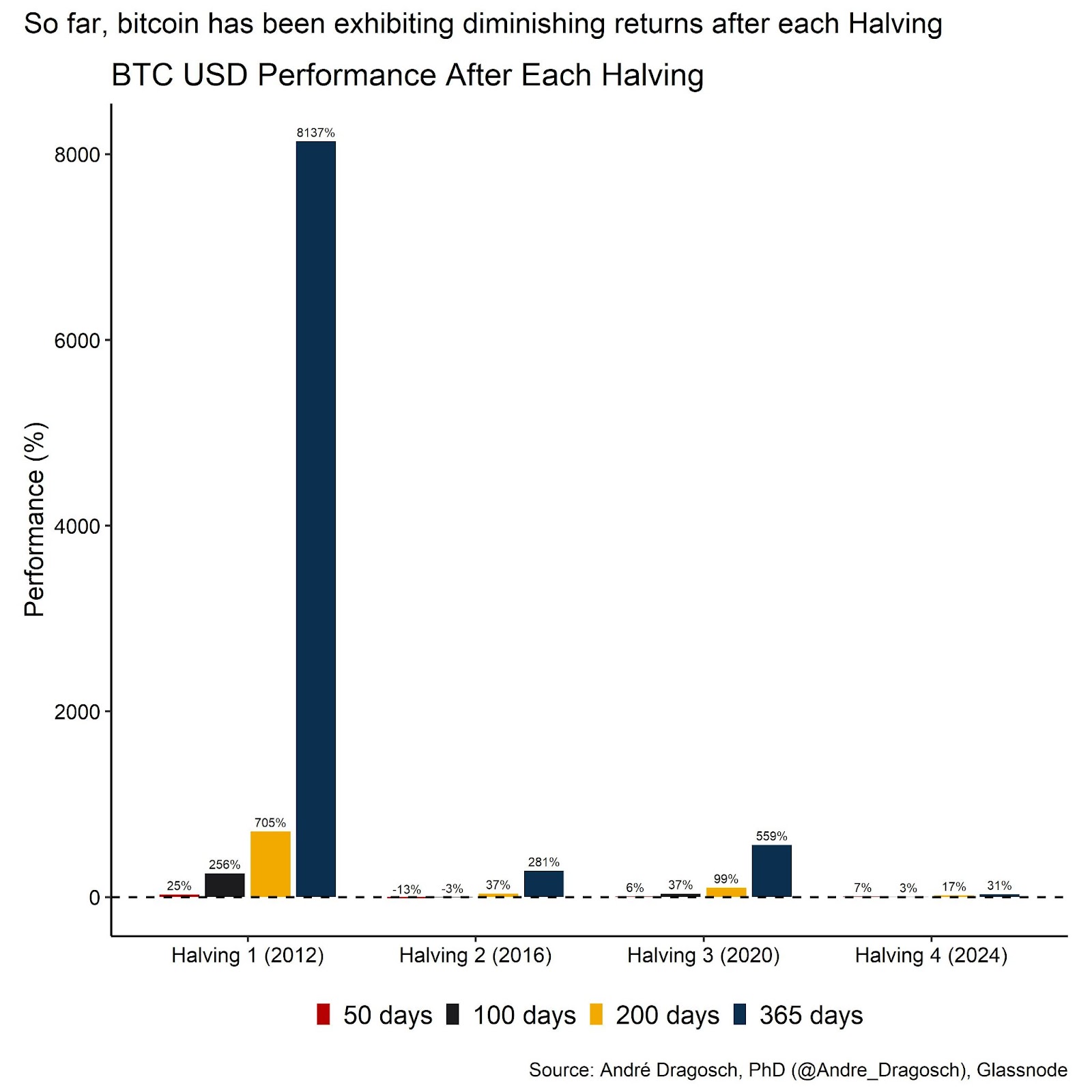 This decline in the Halving effect is often seen as a reason why bitcoin has been exhibiting diminishing returns with each new subsequent Halving cycle: