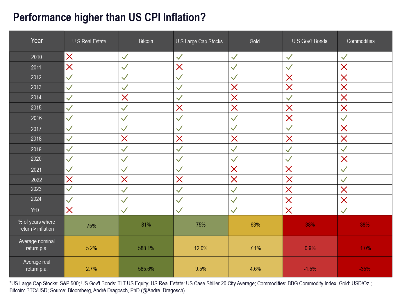 In fact, the table below not only reveals that bitcoin exhibited the highest average real return since 2010 but also that bitcoin managed to outperform U.S. CPI inflation in more than 80% of the years considered.
