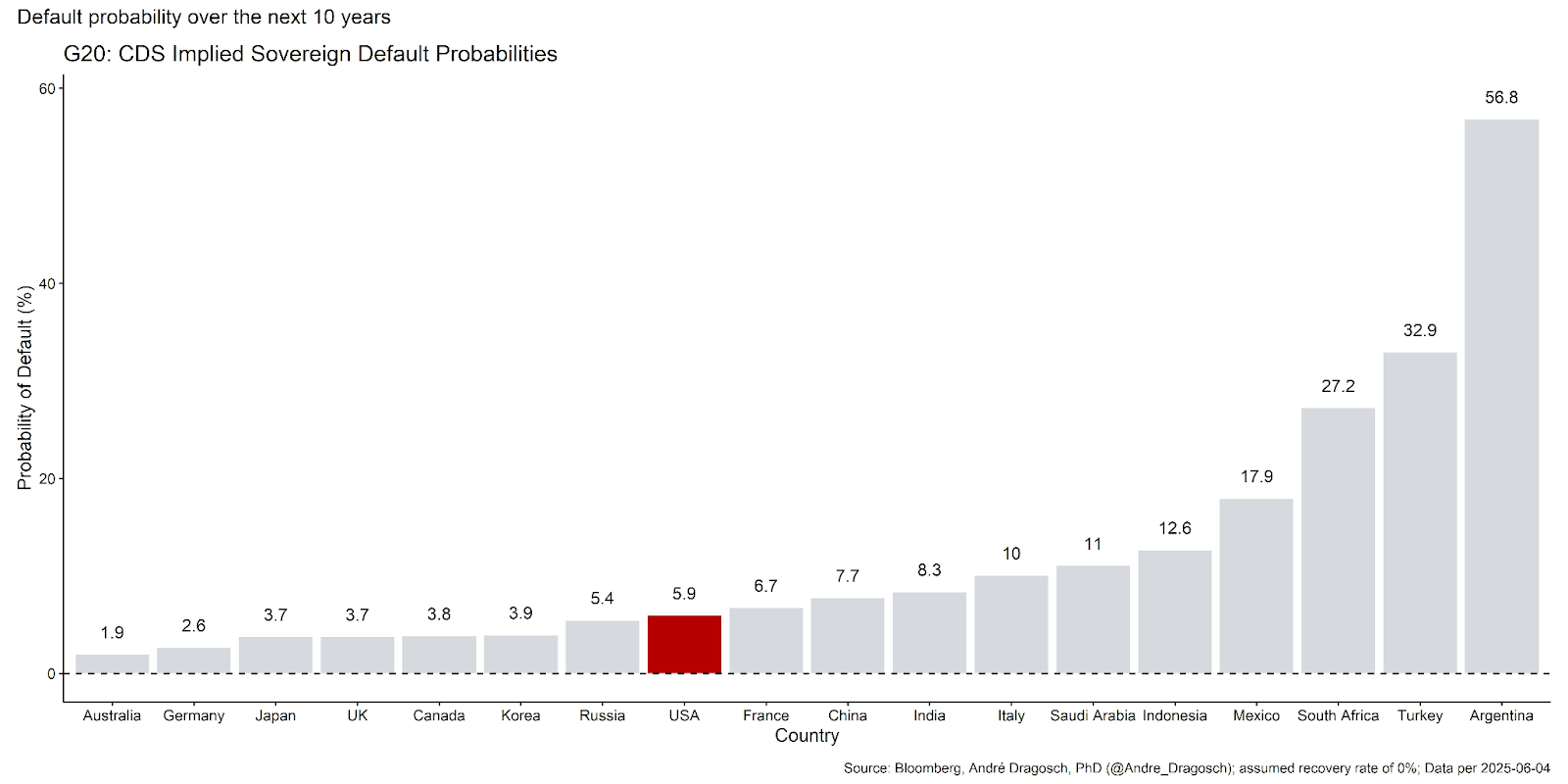 The following chart shows the G20 sovereign’s default probability implied by their 10-year CDS spreads.