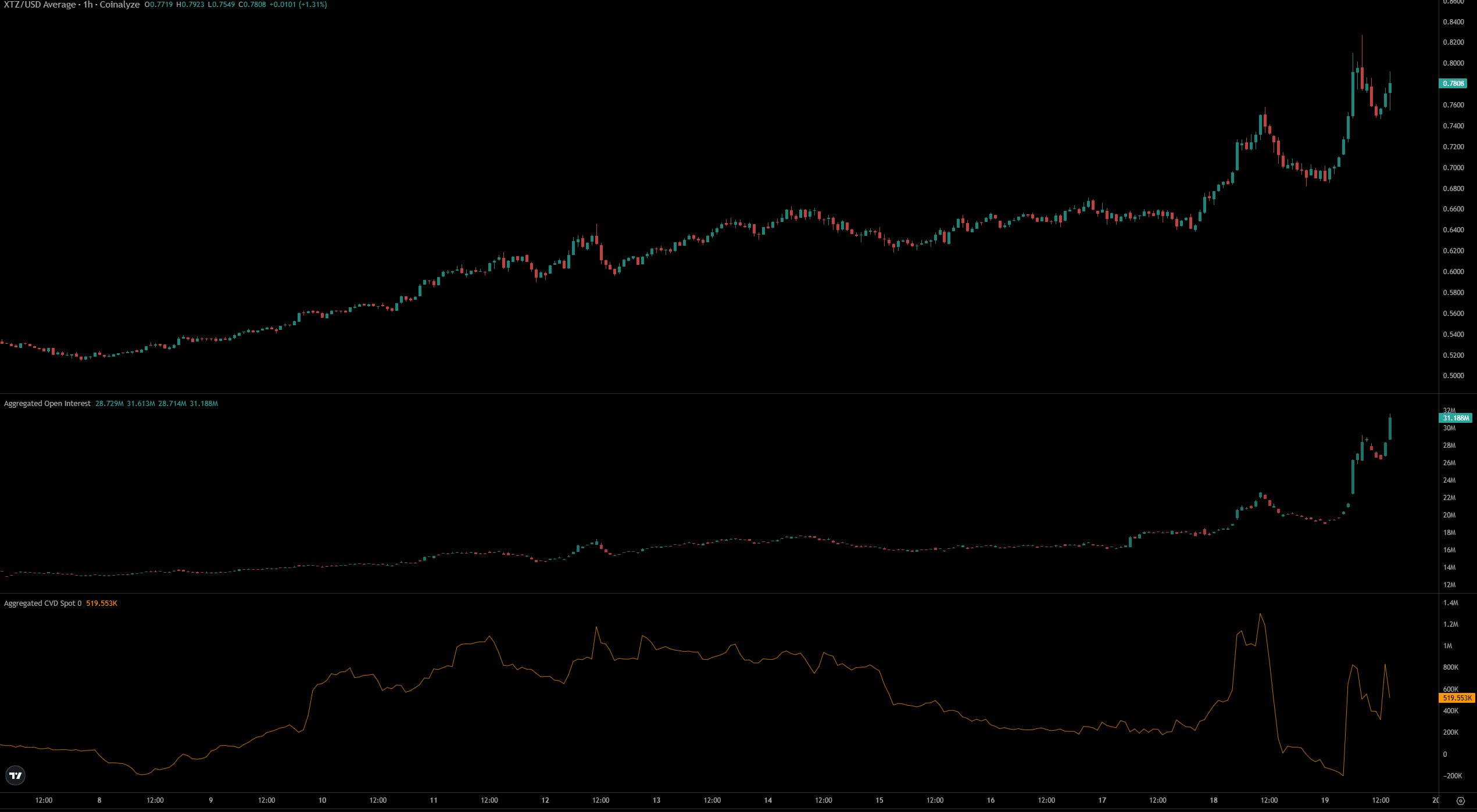 Tezos [XTZ] has gained 8.2% in the past 24 hours on the price charts. Coinalyze data showed that its Open Interest was up 51.2% in the same period.