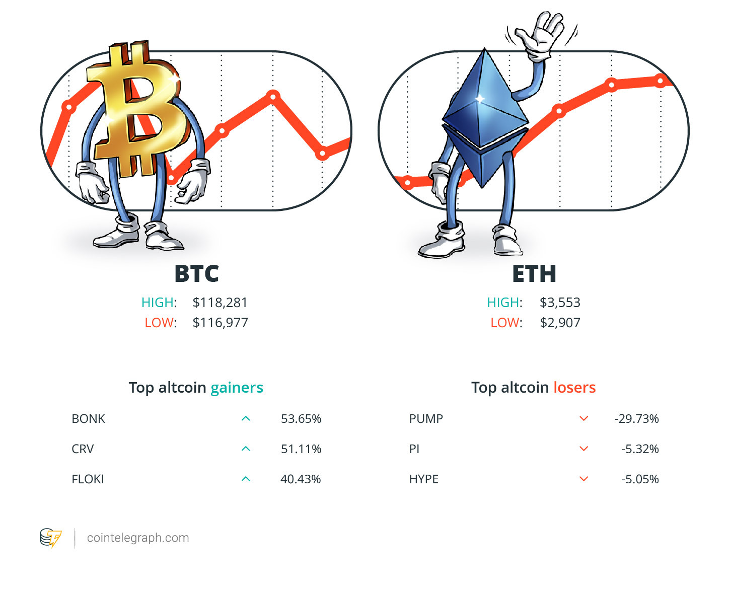 At the end of the week, Bitcoin (BTC) is at $118,281, Ether (ETH) at $3,553 and XRP at $3.43. The total market cap is at $3.85 trillion, according to CoinMarketCap.