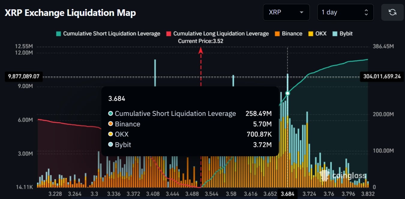 Meanwhile, traders are heavily betting on the bearish side, with nearly $260 million worth of short positions opened around the $3.68 level.