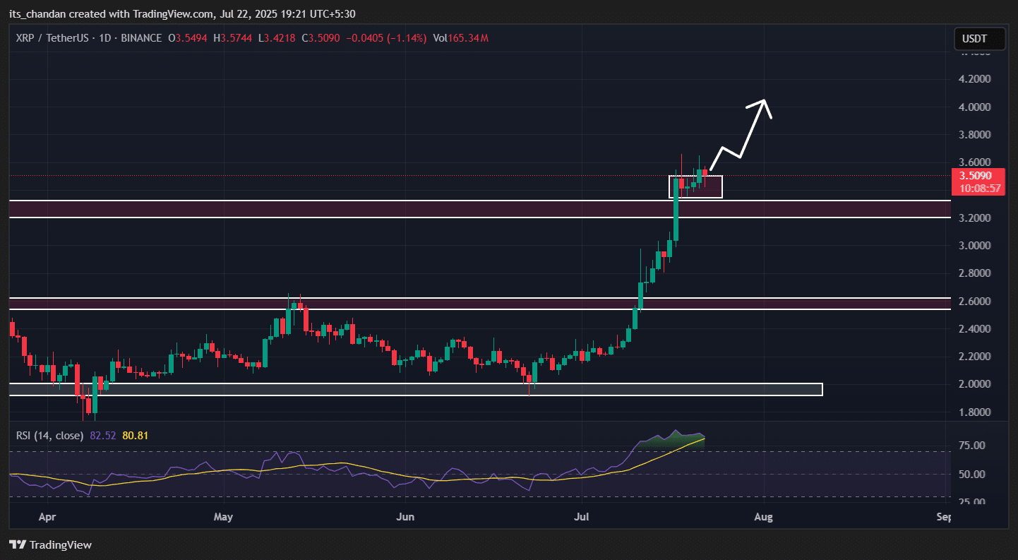 XRP consolidated above $3.35 after ATH, with mixed trader sentiment. Experts were bullish amid ETF optimism and a technical breakout, but the overbought RSI suggested a potential short-term correction before further gains.