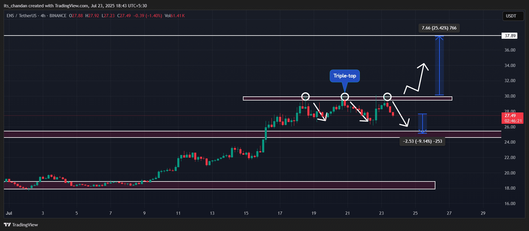 If ENS continues to decline, there is a strong possibility that it could drop by 8% and reach the $25.20 level.
