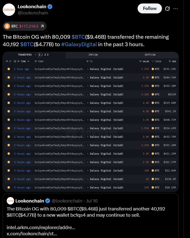 These transactions were tied to a Bitcoin investor who moved 80,009 BTC from a dormant wallet earlier this month — coins that were later transferred to Galaxy, according to Lookonchain data from July 16–17.