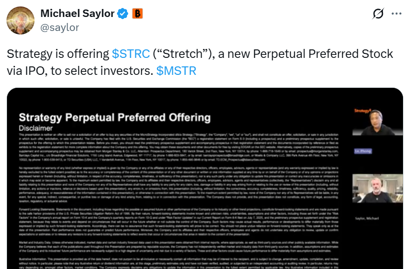 The new offering will be available through an initial public offering (IPO) to “select investors,” Saylor said in a Monday X post.