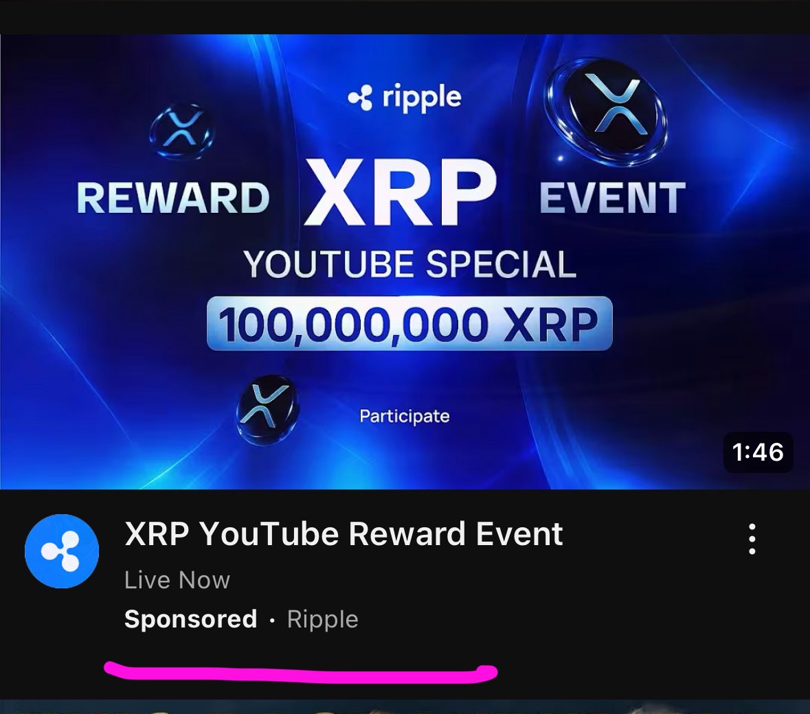 An X user under the handle XtinaRP said one of these scams was active as of Tuesday and promised a free XRP giveaway to lure victims. It displays the video as being sponsored by Ripple.