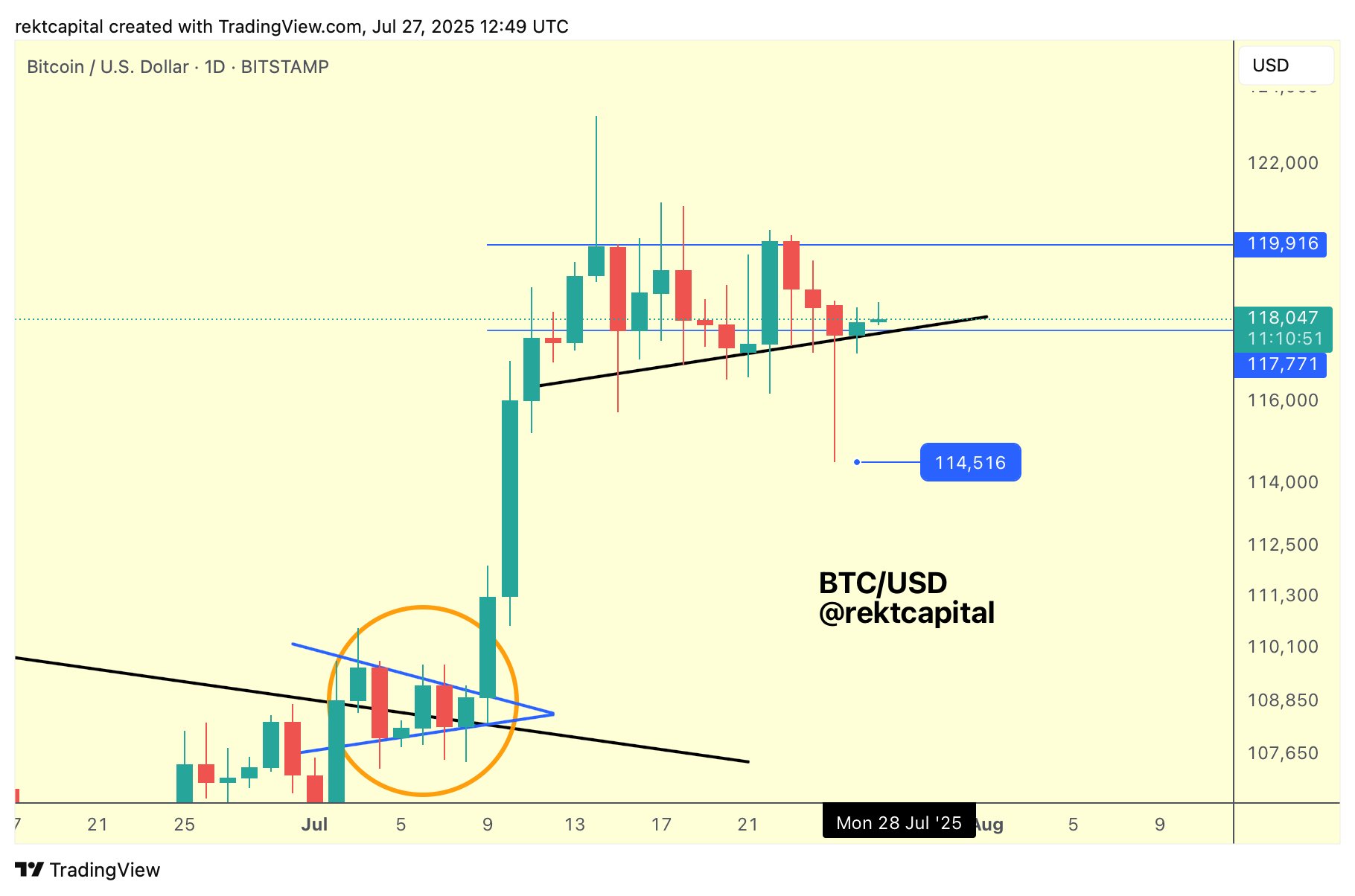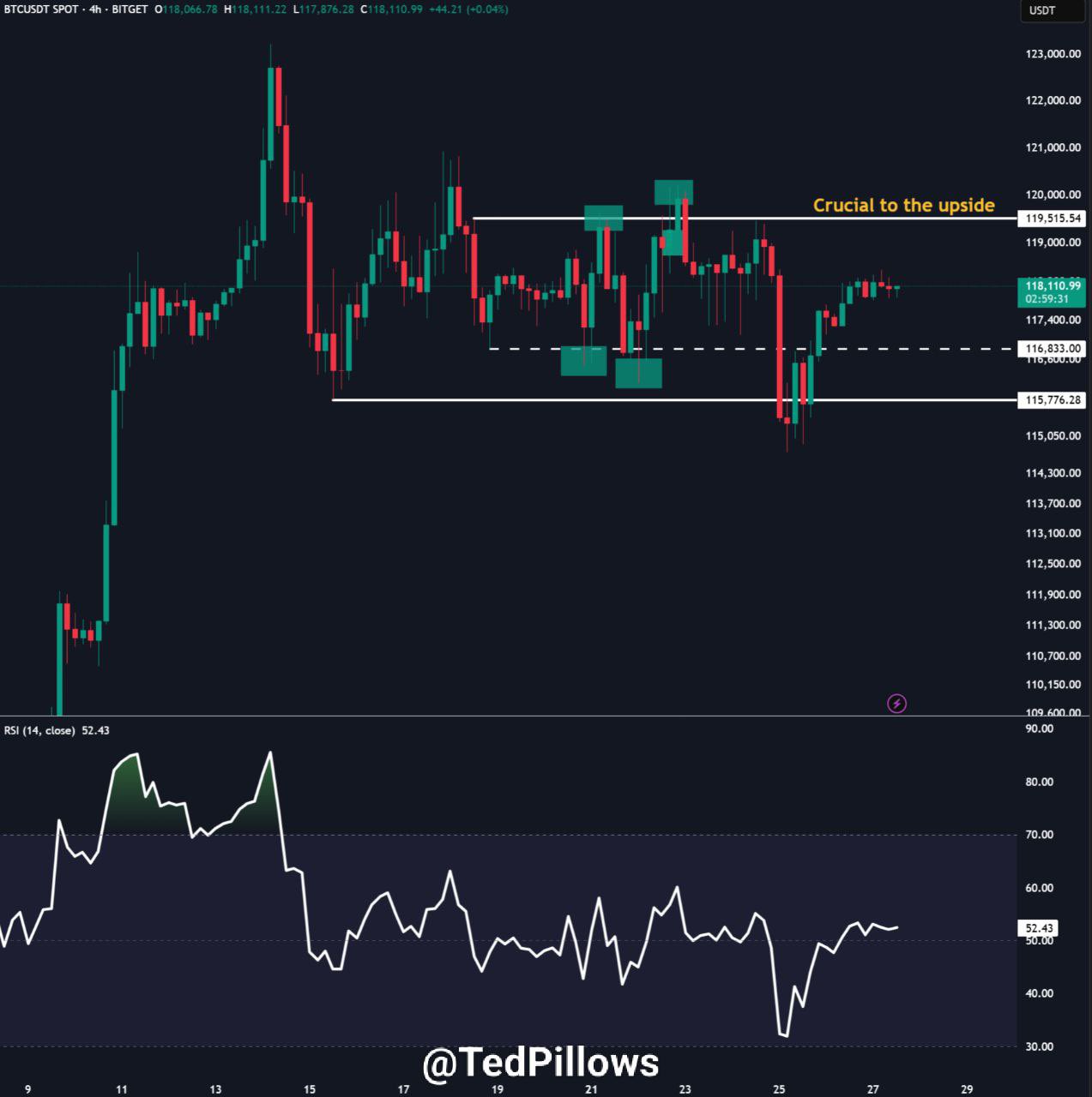 “$BTC needs to break above $119.5K for a big move. If that doesn’t happen, this consolidation will continue,” crypto investor and entrepreneur Ted Pillows summarized in a post on X.