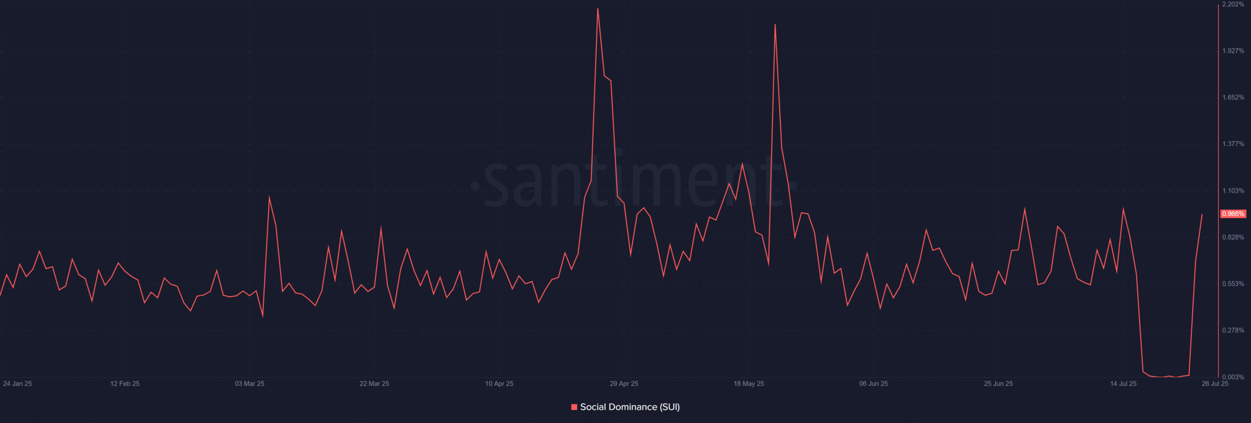 SUI’s Social Dominance spiked to 0.966%, as of writing, reflecting renewed community interest after a quiet period.