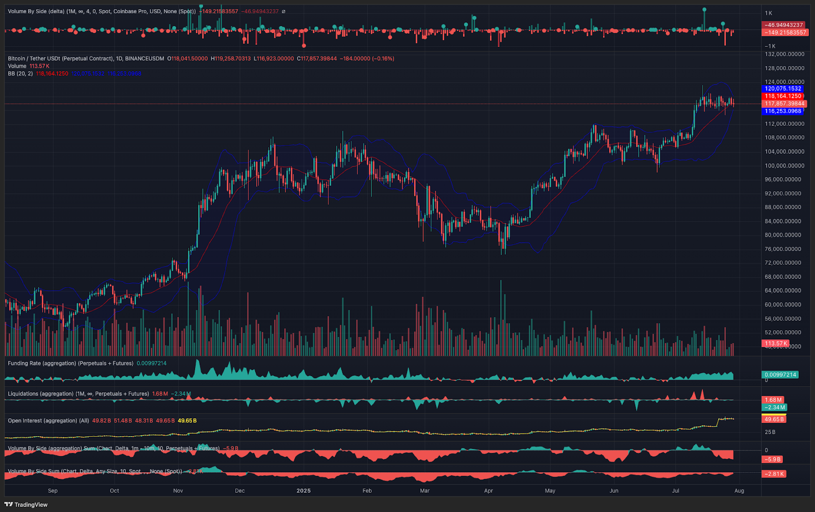 The Bollinger Bands are also near pinched to a close, reinforcing Bitcoin’s price compression and brewing range expansion.