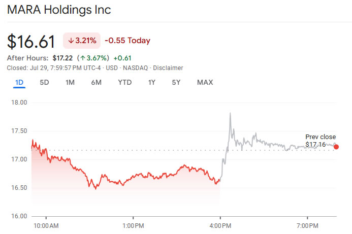 With its earnings release, shares in MARA Holdings (MARA) spiked to a high of 7.5% in after-hours trading on Tuesday to $17.82 before cooling to $17.22.