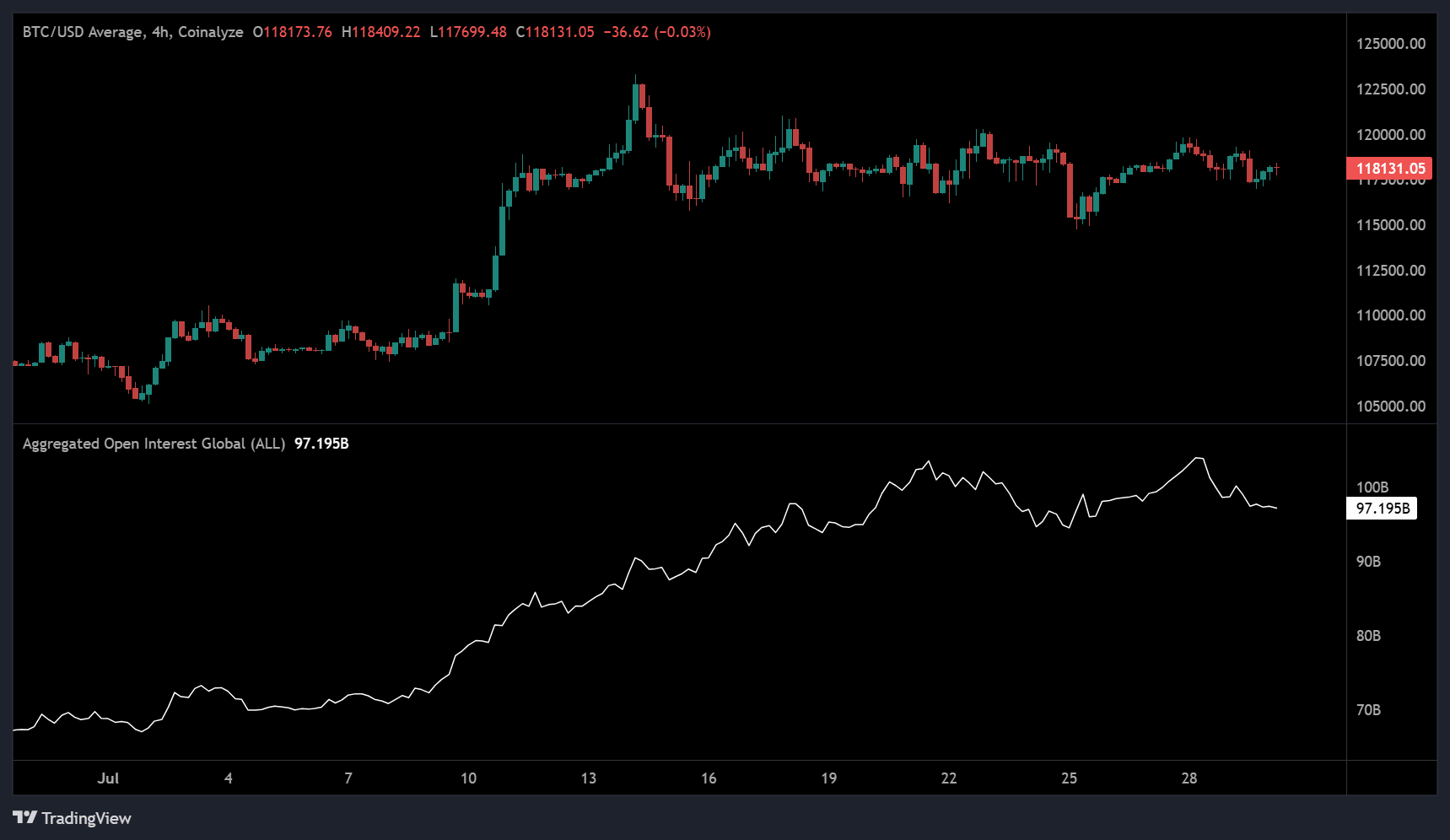 Over the same period, the de-risking also triggered a slight dip in aggregated Open Interest (OI) across all exchanges and all crypto assets, from $101 billion to $97 billion.
