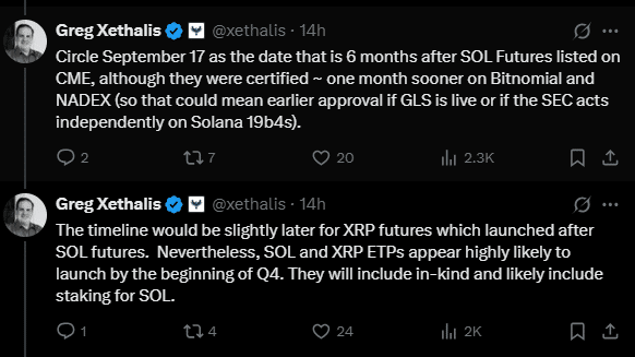 If the new General Listing Standard (GLS) rules were to be applied as they are, spot SOL ETF approval could happen earlier (September 17) than XRP, added Xethalis.