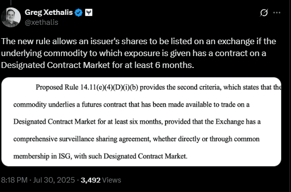 According to Greg Xethalis, general counsel at VC MultiCoin Capital, the new “generic listing standards” would tie approval to the Futures market.