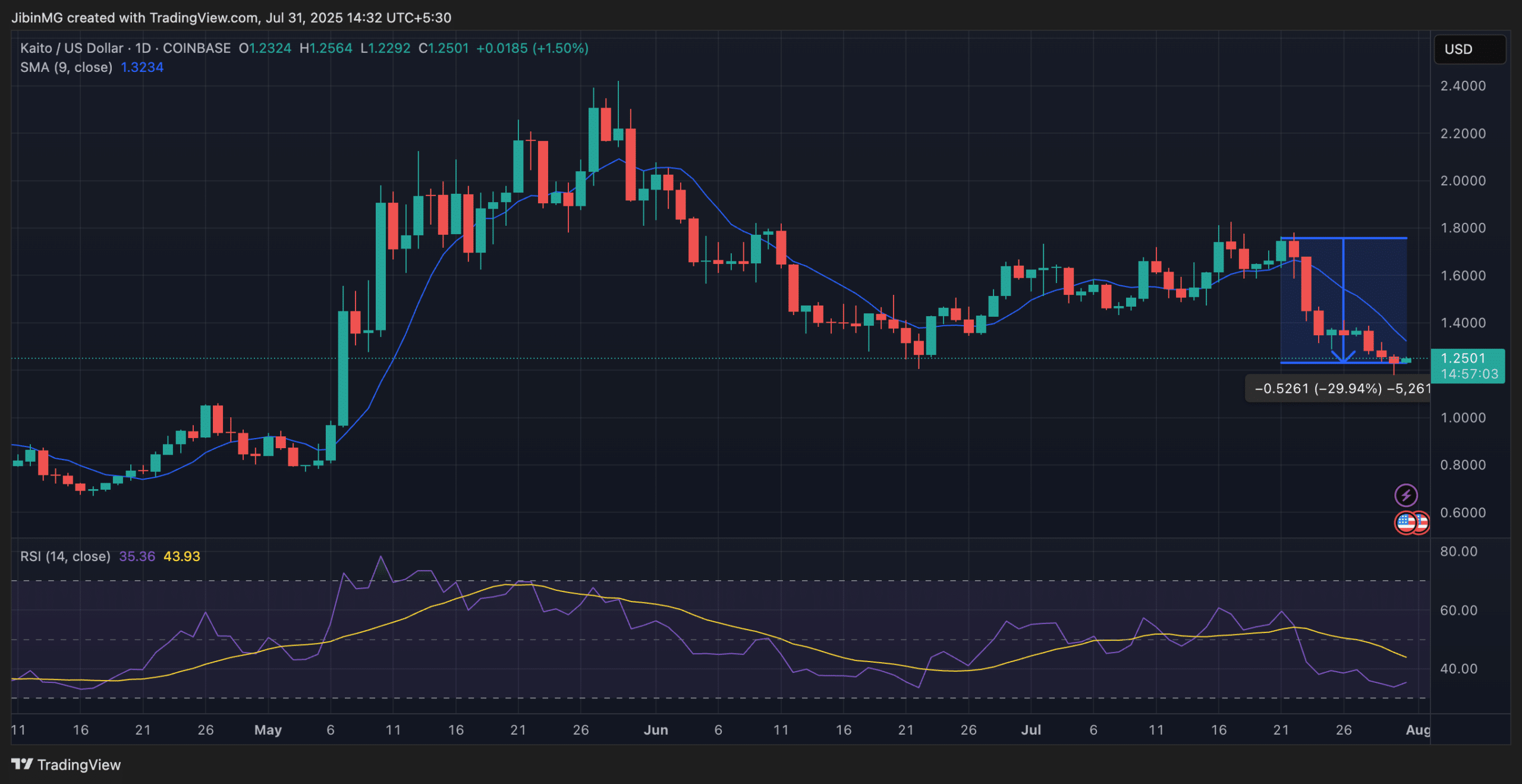 - Market Snapshot – As of mid-2025, Kaito boasts a market cap of around $320.39 million, with over 241 million KAITO tokens in circulation. Its fully diluted valuation sits at a hefty $1.63 billion, signaling that investors are betting big on its future.