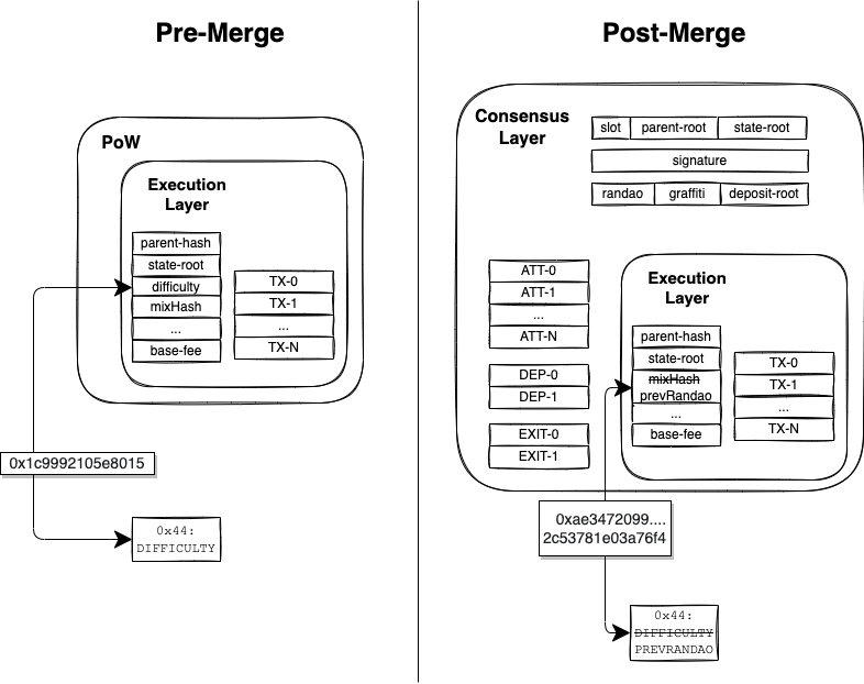 Pre-merge, we see the 0x44 opcode returns the difficulty field in the block header. Post-merge, the opcode, renamed to PREVRANDAO, points to the header field which previously contained mixHash and now stores the prevRandao value from the beacon chain state.
