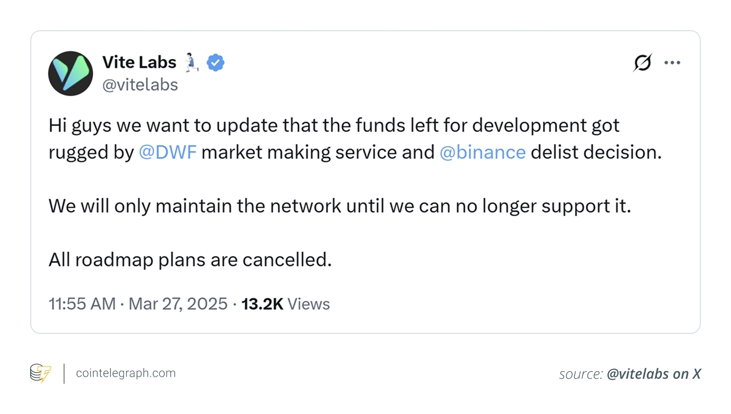 Why questionable: On March 27, 2025, Vite Labs stated its development funds were “rugged” by DWF’s market-making services and Binance’s decision to delist the project.
