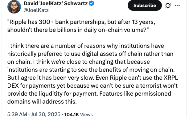 “But I agree it has been very slow,” he said, reasoning Ripple’s choice not to rely on the XRPL DEX for payments was due to concerns related to terrorism financing.