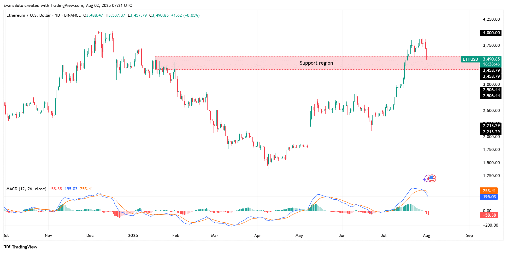 The current support zone between $3,458 and $3,490 is the key battleground. If bulls defend it successfully, ETH may recover.
