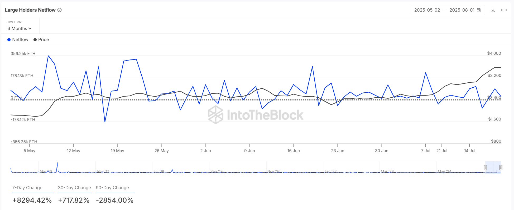Ethereum’s large holder netflows have swung wildly over the past week, with a massive 7-day increase of 8,294% contrasting a -2,854% drop over the past 90 days.