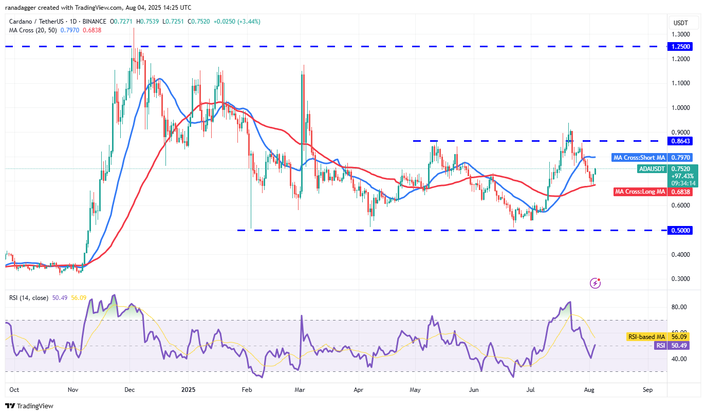 Cardano (ADA) turned up from the 50-day SMA ($0.68) on Sunday, indicating demand at lower levels.