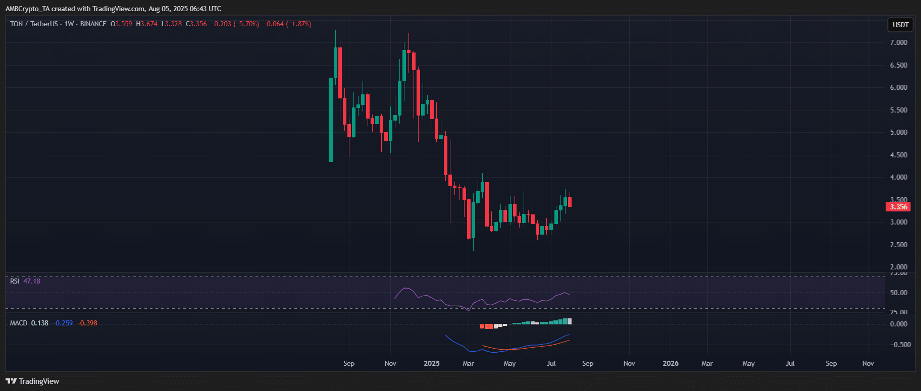And TON? Despite the headline, it couldn’t flip a key resistance. The token opened the week with a red candle, rejecting hard at the $4 psychological level and showing a 5.79% pullback after five straight green weeks.