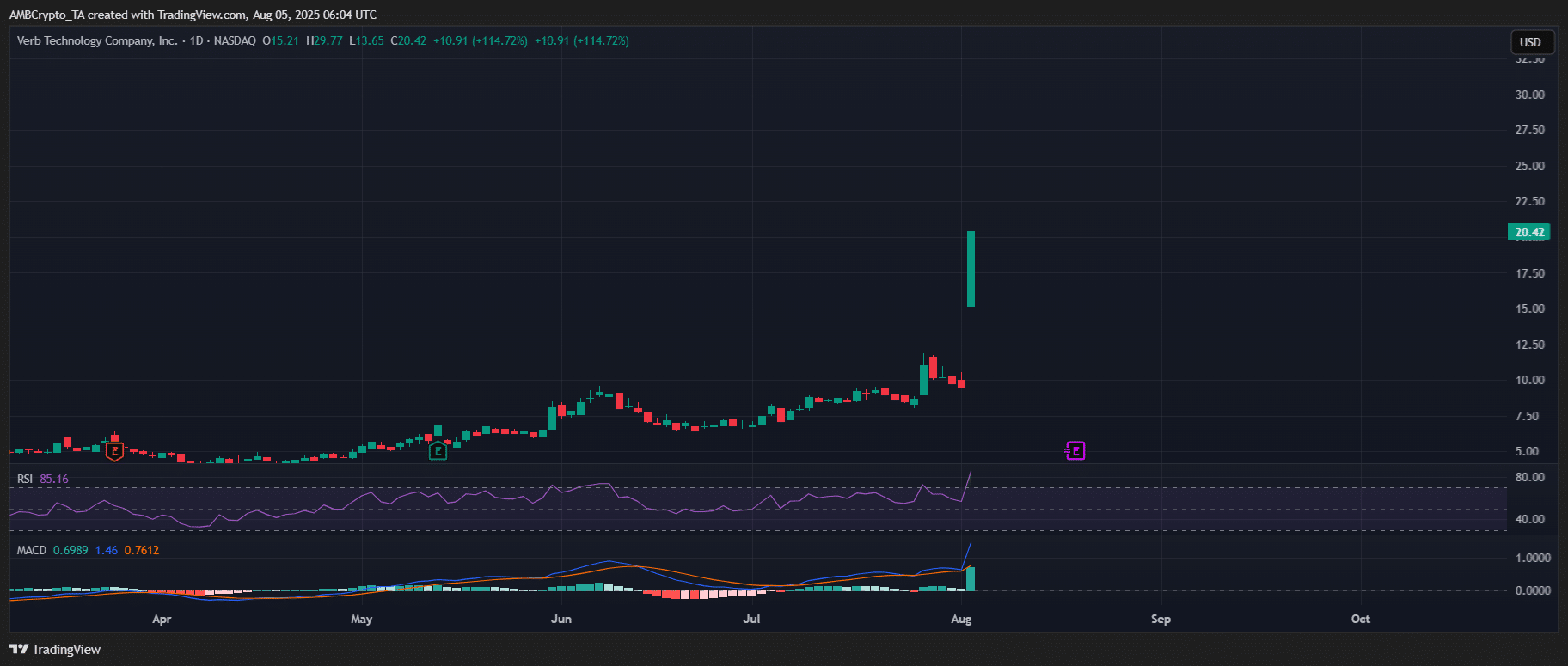 Right now, VERB is trading almost entirely on narrative premium. The idea that it’s the first public proxy for Toncoin exposure. That narrative drove a 115% spike in share price.