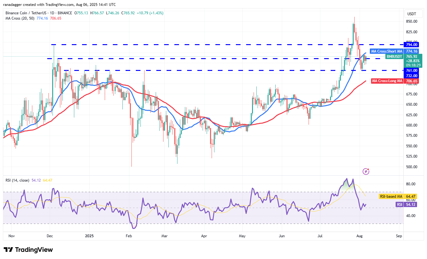 If the price rises above the 20-day SMA, the BNB/USDT pair could climb to $794. Sellers will again try to halt the up move at $794, but if the bulls prevail, the pair could rally to $815 and then to $861.